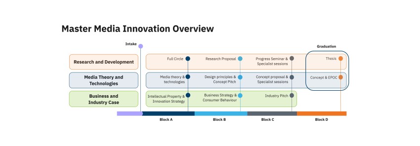 In the final part of the Master Media Innovation, students both write a master's thesis on a topic of their choice and also create an innovative media concept. The Thesis section of the graduation involves the writing up of research conducted by the student which is assessed by a panel and, when satisfactory, concludes with an oral defence. The Media Concept section of the graduation involves the written conceptualisation of an innovative media product, as well the creation of an electronic proof of concept, assessed by a panel and, when found to be satisfactory, concludes with a pitch presentation.