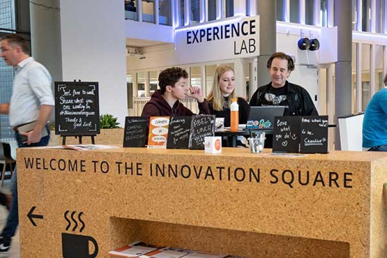 Dit realiseren we door alles samen te brengen op Innovation Square. Hier stimuleren we onze studenten, docenten en onderzoekers, om nieuwe kansen te verkennen, te ondernemen en de samenwerking te zoeken met het werkveld. Het sterke aan dit concept is dat we innovatieve en creatieve ondernemers in huis halen. Wat kun je doen?